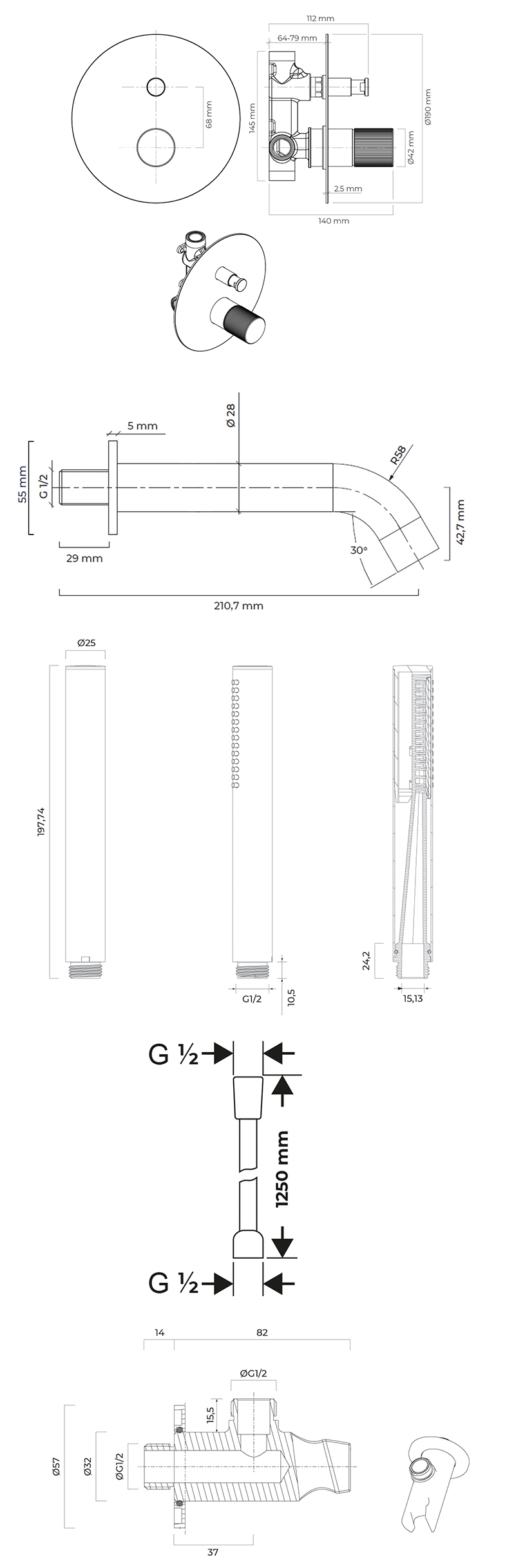 | W zestawie | bateria z przełącznikiem, wylewka wannowa, słuchawka prysznicowa, wąż prysznicowy, przyłącze kątowe |