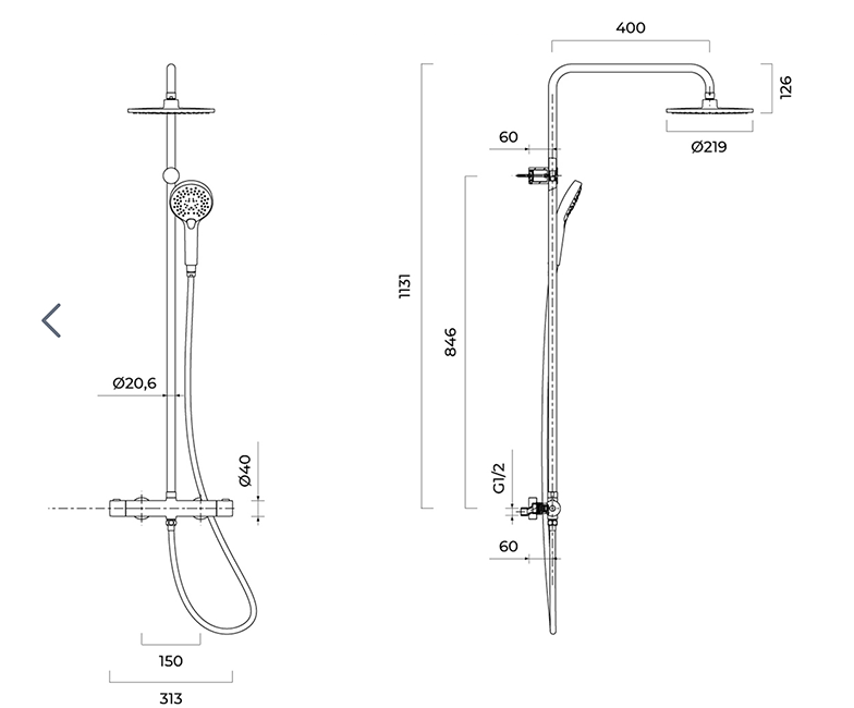 Poznaj wymiary poszczególnych elementów zestawu prysznicowego Oltens Atran: